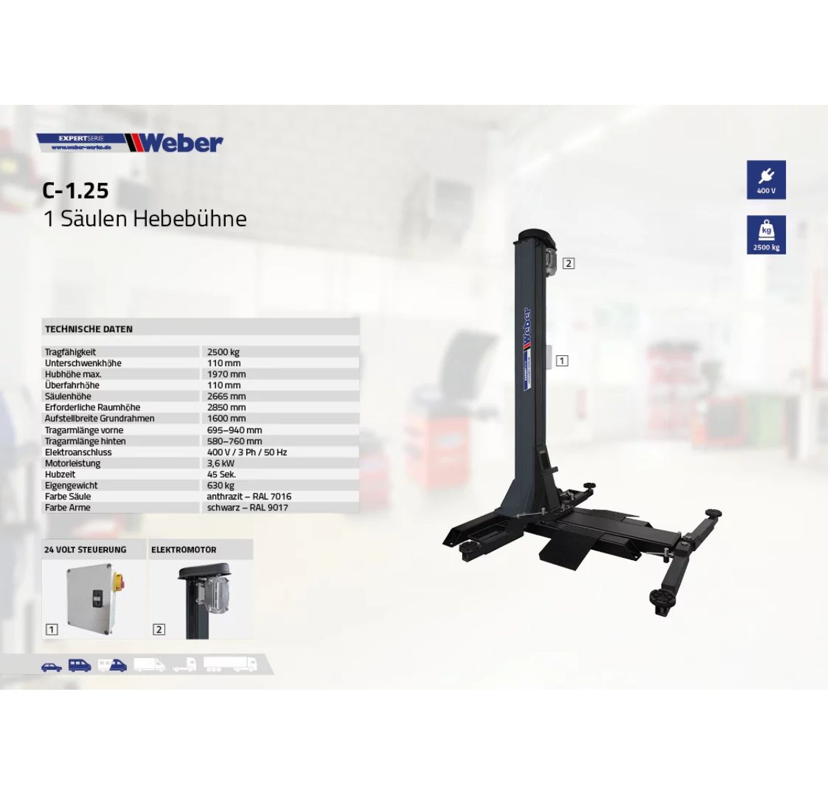 Podnośnik jednokolumnowy śrubowy Weber Expert Serie C-1.25 to doskonałe rozwiązanie dla profesjonalnych warsztatów i serwisów. Z maksymalną nośnością 2500 kg i asymetrycznymi ramionami, zapewnia wyjątkową stabilność oraz łatwy dostęp do pojazdu z trzech stron. Dzięki solidnej konstrukcji, niskiemu profilowi i wysokiej jakości materiałom, podnośnik doskonale sprawdza się przy podnoszeniu samochodów osobowych oraz małych transporterów. Jest to niezawodny sprzęt, który wyróżnia się długowiecznością, prostą obsługą i minimalnym zużyciem dzięki zastosowaniu dużych gwintów i nakrętek.