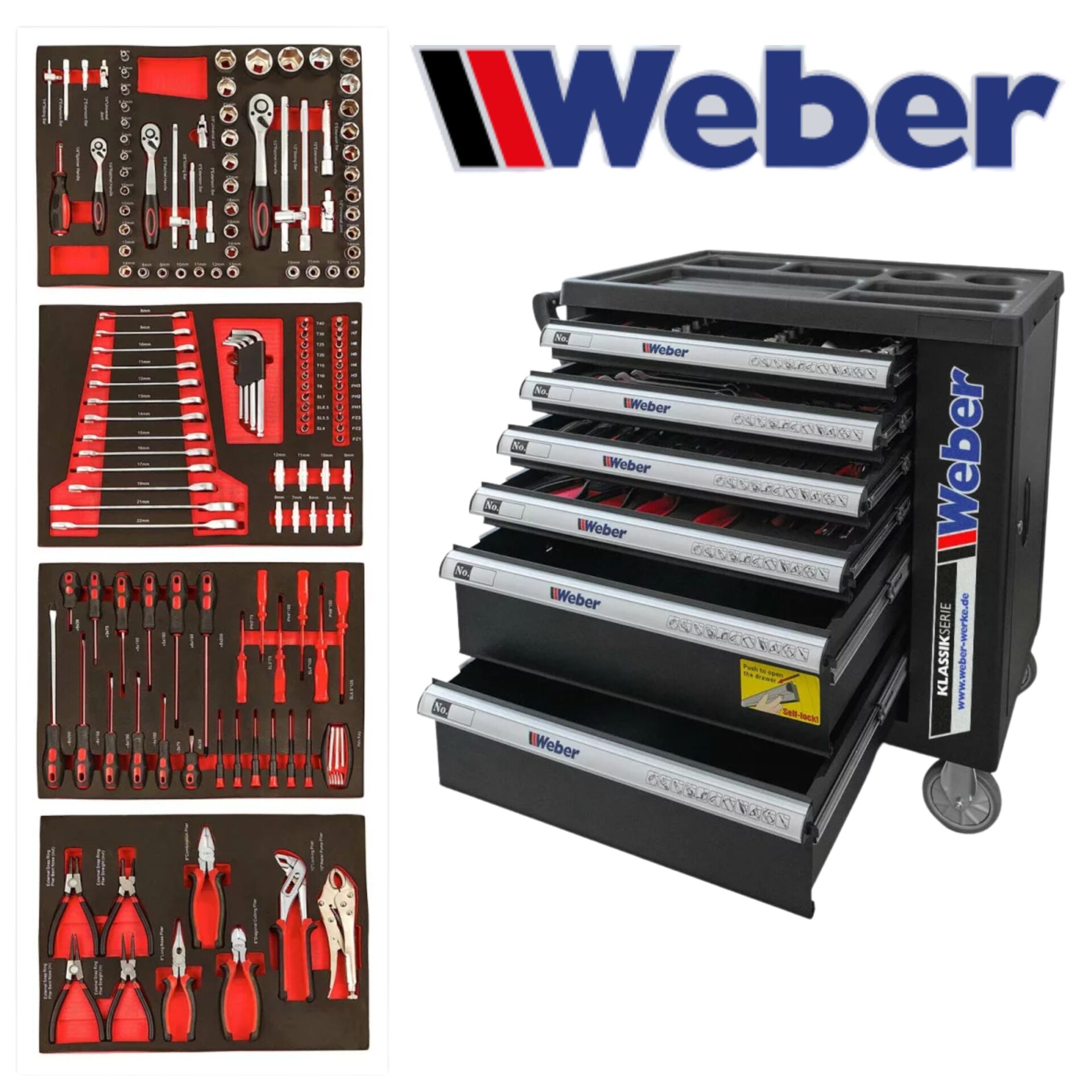 Mobilny wózek warsztatowy Weber to kompletny zestaw 154 narzędzi, zamknięty w wytrzymałej, funkcjonalnej konstrukcji. Dzięki odpornej powłoce, blokowanym szufladom oraz ergonomicznym rozwiązaniom, produkt łączy trwałość, bezpieczeństwo i komfort pracy. Niemiecka precyzja marki Weber gwarantuje satysfakcję nawet przy intensywnym użytkowaniu.
