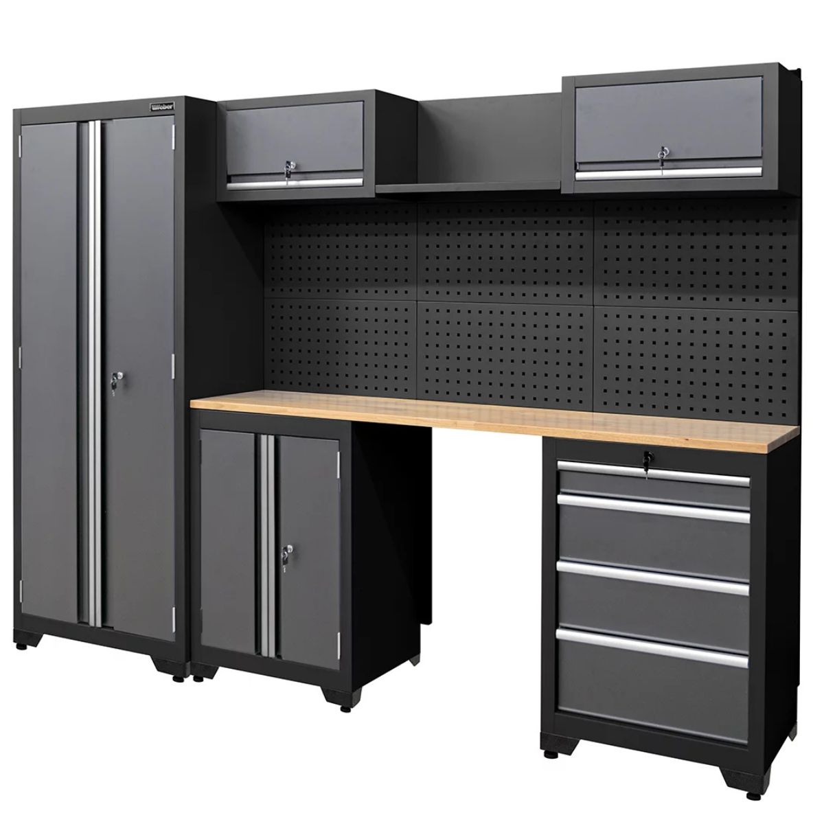 Zestaw oferuje dużą przestrzeń roboczą i wiele opcji przechowywania, co przekłada się na większy porządek i efektywność. Górne szafki posiadają sprężyny gazowe, dzięki czemu otwierają się lekko i bez oporu, a drzwi i szuflady zamykane są na klucz, więc masz pełną kontrolę nad bezpieczeństwem swoich narzędzi.