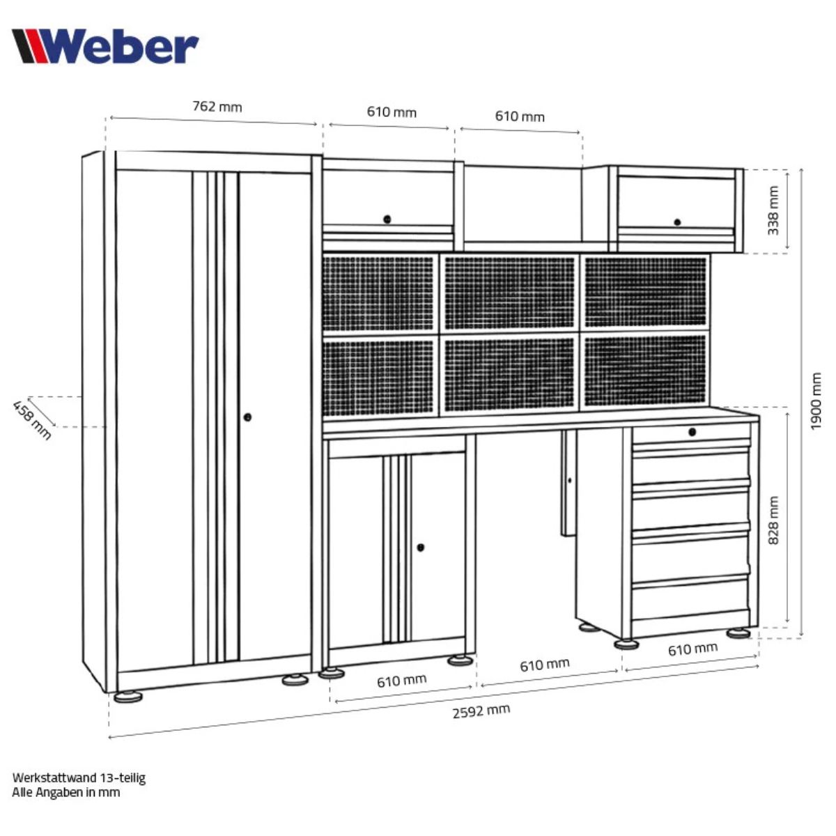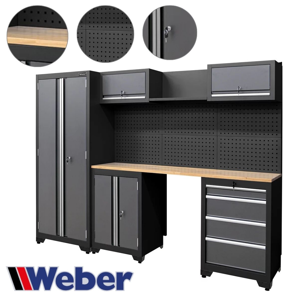 Szafa warsztatowa z zamkiem marki Weber model WZ-WW13WT to kompletny, 13-częściowy system przechowywania, który łączy niemiecką niezawodność z nowoczesną funkcjonalnością. W zestawie znajdziesz wysoką szafkę z regulowanymi półkami, dolne szafki z drzwiczkami i szufladami na kulkowych prowadnicach, a także ściany narzędziowe, na których łatwo uporządkujesz swoje narzędzia.